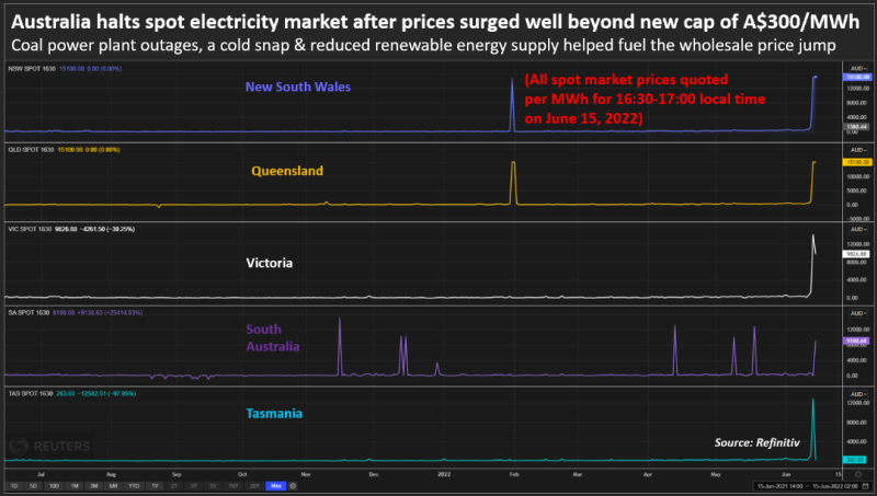 此前的6月15日,AEMO發(fā)布公告,從澳大利亞東部標準時間14:05起暫停澳洲東部的電力現(xiàn)貨市場,采取臨時價格機制出清,并對停運期間進入市場的合格發(fā)電商實行補償。這是澳大利亞首次暫停電力現(xiàn)貨市場運行,事件引發(fā)業(yè)界熱議。