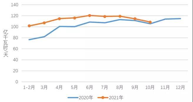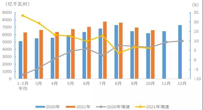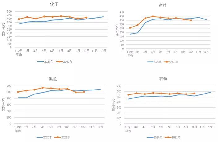 1-10月,化工行業(yè)用電量4156億千瓦時,同比增長8.1%,增速比上年同期提高7.7個百分點;建材行業(yè)用電量3434億千瓦時,同比增長10.0%,增速比上年同期提高7.5個百分點;黑色金屬冶煉行業(yè)用電量5302億千瓦時,同比增長8.8%,增速比上年同期提高5.6個百分點;有色金屬冶煉行業(yè)用電量5558億千瓦時,同比增長7.2%,增速比上年同期提高3.6個百分點。