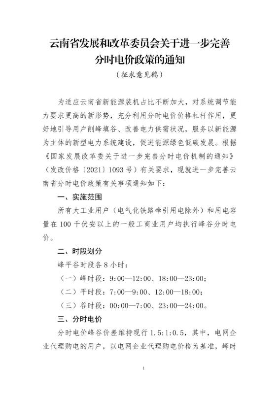 云南:公開征求進(jìn)一步完善分時(shí)電價(jià)政策意見