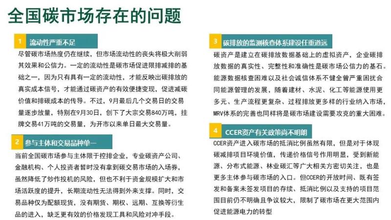 3.全國碳交易市場是能源綠色價值定價的場所。碳排放權(quán)交易市場基本原理在于構(gòu)建“碳資產(chǎn)”來衡量碳排放權(quán)的稀缺性,以“總量-交易”的原則通過確定社會排放總量,允許自由交易來實現(xiàn)碳資產(chǎn)定價,從而將二氧化碳排放這一能源領(lǐng)域重要的外部性實現(xiàn)內(nèi)部化,引導(dǎo)社會生產(chǎn)活動向綠色低碳轉(zhuǎn)型。一定的流動性是碳市場可持續(xù)發(fā)展的生命線,當(dāng)前市場流動性仍較差,但是9月最后幾個交易日的交易量逐步放量,特別在9月30日,創(chuàng)下了開市以來單日最大交易量。隨著全國碳市場的擴(kuò)圍和新產(chǎn)品的豐富,碳市場價格及交易量仍值得期待。