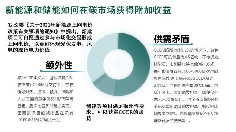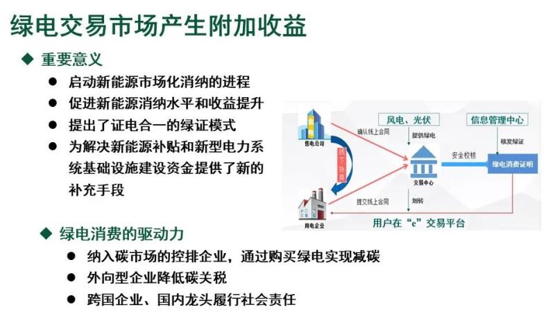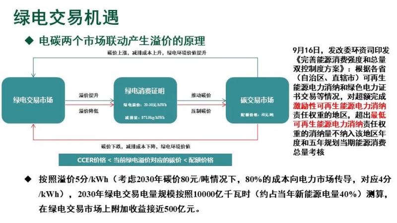 4.綠電市場使新能源綠色價值凸顯。綠電交易市場通過體制機制創(chuàng)新,一方面充分體現(xiàn)新能源電力的綠色低碳價值,另一方面為企業(yè)獲得綠色電力提供了普惠性的渠道。綠電市場中,綠證代表的環(huán)境價值與電量價值并軌及統(tǒng)一出售,實現(xiàn)了交易中的溢價(附加電價),也實現(xiàn)了綠電與綠證的“電證合一”,以此提升新能源進(jìn)入電力市場的意愿。推進(jìn)綠電減碳效果在全國碳市場及國際上得到認(rèn)可,能降低控排企業(yè)在碳市場的履約成本,化解出口企業(yè)被征收“碳關(guān)稅”的風(fēng)險,同時可再生能源超額消納量在能源“雙控”中不被考核,此三點是綠電市場產(chǎn)生較高溢價的主要原因。與申請CCER資產(chǎn)相比,由于CCER受到抵消比例限制,通過綠電市場實現(xiàn)新能源的綠色價值相對來說更具普遍意義,理論上,電碳兩個市場充分聯(lián)動下,綠電溢價應(yīng)與對應(yīng)的碳配額價格掛鉤。