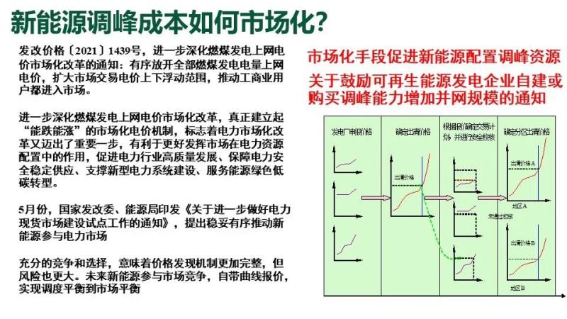 2.建立健全的市場機制是構(gòu)建新型電力系統(tǒng)的重要方面。新能源具有低邊際成本、高系統(tǒng)成本以及綠色環(huán)保的特性,構(gòu)建完善的市場機制:通過電碳市場聯(lián)動體現(xiàn)新能源綠色環(huán)保的價值;通過輔助服務(wù)、容量市場等電力市場新品種的設(shè)計,促使新能源通過自建和購買調(diào)節(jié)資源,是實現(xiàn)新能源與電力系統(tǒng)協(xié)同發(fā)展的重要條件。從最近發(fā)布的政策來看,能源主管部門正在推進(jìn)針對新能源不同特性的市場的建設(shè)。