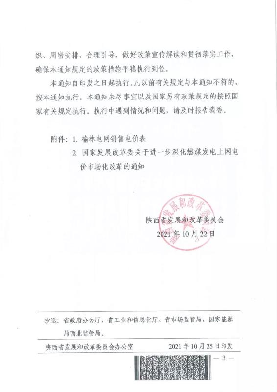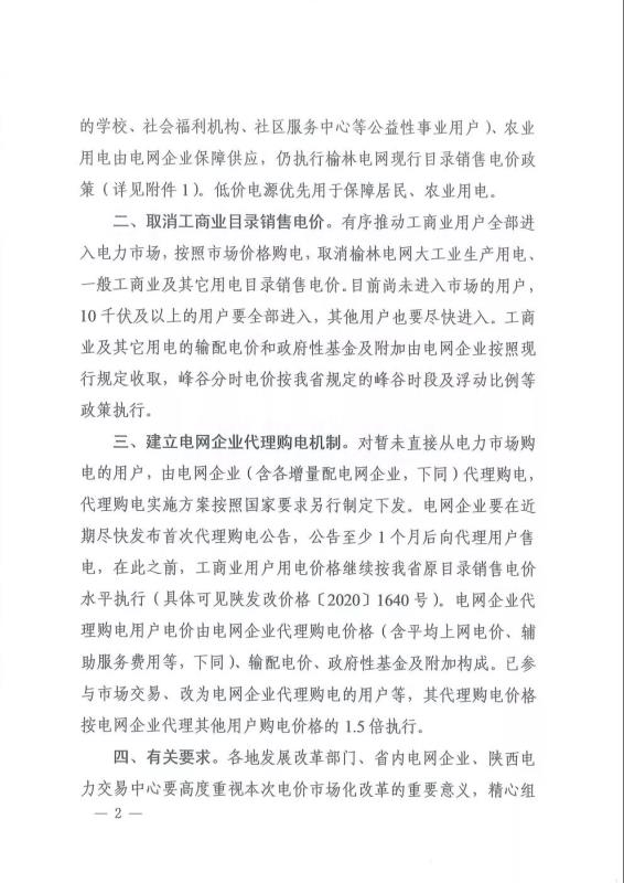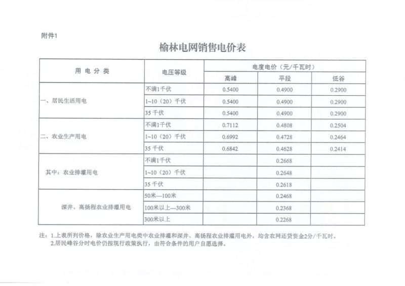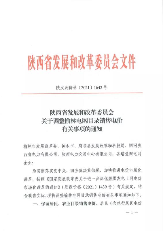 陜西:關(guān)于調(diào)整榆林電網(wǎng)目錄銷售電價(jià)有關(guān)事項(xiàng)的通知