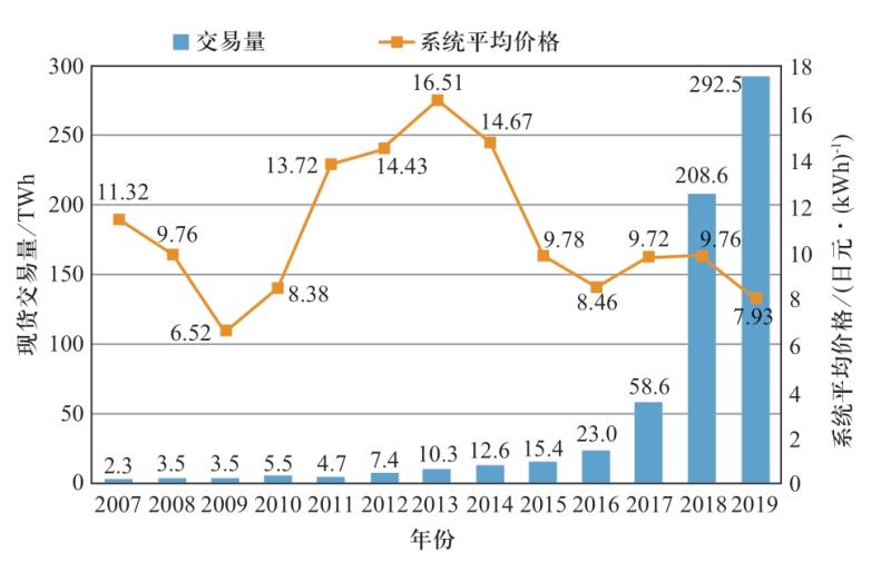 圖9 日本電力交易所現(xiàn)貨交易量及系統(tǒng)平均價格