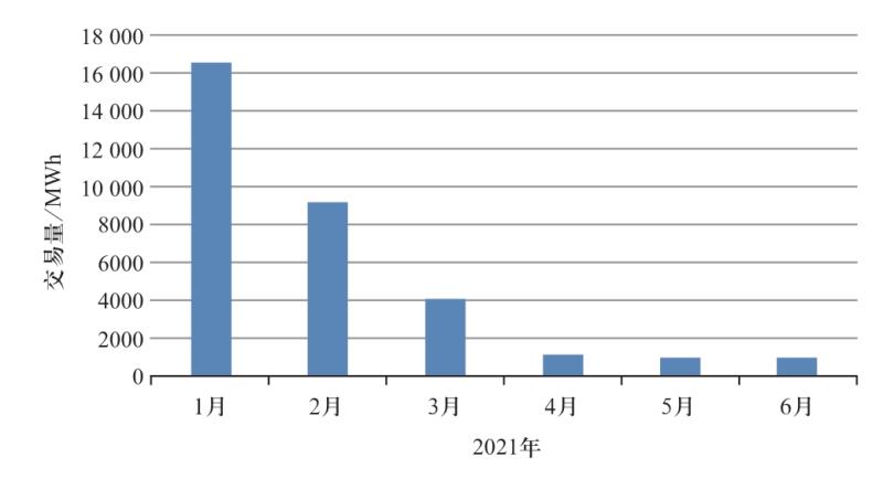 2019年9月17日,日本東京商品交易所正式上線了日本首個電力期貨交易,用以降低電價波動風(fēng)險。具體來看,新電力期貨合約包括東京基本負荷期貨、東京峰值負荷期貨、關(guān)西基本負荷期貨和關(guān)西峰值負荷期貨,上述期貨合約將使用JEPX公布的相關(guān)地區(qū)(東京或關(guān)西)30 min現(xiàn)貨市場(日前)價格的算術(shù)平均值,以日元進行現(xiàn)金交割。交易周期為15個月,交易方式為集中競價。2021年東京商品交易所電力期貨交易量如圖4所示。