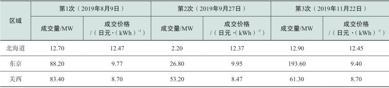 如表1所示,2020年日本交割的基荷電力分別于2019年8月、9月和11月進行了競價交易,分為北海道、東京和關(guān)西3個區(qū)域市場進行。從交易價格來看,基荷電力市場價格并不低于現(xiàn)貨市場平均價格(2019年現(xiàn)貨市場均價7.93日元/kWh),基荷市場并未突顯價格優(yōu)勢。從交易量來看,3個市場成交量為534.3 MW,相當(dāng)于每年4.68 TWh,僅占新電力公司2019年度全部售電量(129.1 TWh)的3.6%。