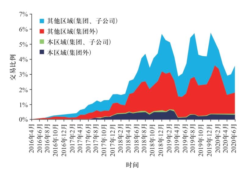 日本中長期交易主要以十大電力公司內(nèi)部交易為主,如圖3所示。以2020年4—6月為例,某十大電力公司之一發(fā)電量為2390 GWh,內(nèi)部交易電量1780 GWh,占比74.5%。十大電力公司外部雙邊交易較少,2020年6月對外雙邊交易量為2155 GWh,占全國電力消費的3.61%,集團外的雙邊合約為1.74%(1040 GWh), 占新電力需求(10 600 GWh)的9.8%[16]。