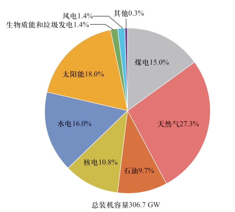 截至2020年4月,日本的總發(fā)電裝機容量為306.7 GW,其中包括52.0%的火電(煤炭15.0%,天然氣27.3%,石油9.7%),10.8%的核電,16.0%的水電和21.1%的可再生能源(不含水電),如圖1所示。2011年以來,日本核電裝機容量逐漸減少,天然氣發(fā)電占主要位置[10]。