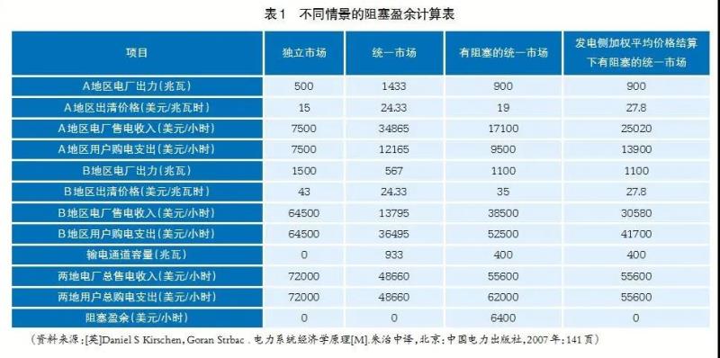 現(xiàn)貨市場(chǎng)阻塞盈余的管理對(duì)策。目前我國(guó)在處理現(xiàn)貨市場(chǎng)阻塞盈余問(wèn)題上就有兩種選擇,廣東現(xiàn)貨市場(chǎng)設(shè)計(jì)中保留了阻塞盈余,同時(shí),由于雙軌制原因產(chǎn)生了負(fù)阻塞盈余。山東電力現(xiàn)貨市場(chǎng)設(shè)計(jì)中則沒(méi)有選擇阻塞盈余,從而避免了相應(yīng)的負(fù)阻塞盈余分配等問(wèn)題。根據(jù)上面的分析,由于我國(guó)電力市場(chǎng)改革暫時(shí)沒(méi)有利用阻塞盈余的政策設(shè)計(jì),阻塞盈余增加了電力現(xiàn)貨市場(chǎng)的復(fù)雜性和利益矛盾,我國(guó)電力現(xiàn)貨市場(chǎng)完全沒(méi)有必要選擇阻塞盈余。如表1“發(fā)電側(cè)加權(quán)平均價(jià)格結(jié)算下有阻塞的統(tǒng)一市場(chǎng)”的計(jì)算結(jié)果所示,發(fā)電側(cè)采用加權(quán)平均電價(jià)結(jié)算不僅不會(huì)產(chǎn)生不平衡資金,而且相比于節(jié)點(diǎn)電價(jià)結(jié)算機(jī)制,在不降低發(fā)電機(jī)組收入的前提下,還降低了用戶的總購(gòu)電支出。英國(guó)電力市場(chǎng)中就沒(méi)有阻塞盈余;相反,在發(fā)電企業(yè)也支付輸配電價(jià)的基礎(chǔ)上,英國(guó)電力市場(chǎng)設(shè)計(jì)把權(quán)益界定給了發(fā)電企業(yè),一旦發(fā)生輸電阻塞,電網(wǎng)企業(yè)必須支付發(fā)電企業(yè)阻塞費(fèi)用;這種阻塞費(fèi)用制度建立了一種從發(fā)電側(cè)促進(jìn)電網(wǎng)投資的機(jī)制,與阻塞盈余相比可能更適合我國(guó)??傊?,阻塞盈余在目前我國(guó)電力現(xiàn)貨市場(chǎng)是典型的“費(fèi)力不討好”的制度選擇。