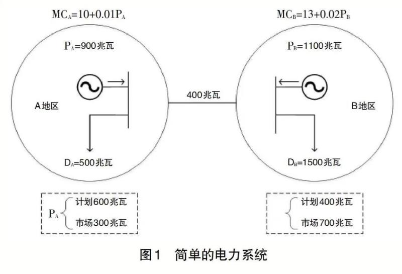 現(xiàn)貨市場(chǎng)負(fù)阻塞盈余的形成機(jī)理。2019 年 5 月廣東電力現(xiàn)貨市場(chǎng)按日試結(jié)算時(shí)出現(xiàn)了負(fù)阻塞盈余現(xiàn)象。阻塞盈余為負(fù)與理論不符,實(shí)際操作中也難以被市場(chǎng)主體理解和接受。有些分析把這個(gè)問(wèn)題解釋得過(guò)于復(fù)雜難懂。實(shí)際上,這個(gè)問(wèn)題很簡(jiǎn)單,由計(jì)劃與市場(chǎng)雙軌制造成,電網(wǎng)企業(yè)無(wú)意中以較大的購(gòu)銷(xiāo)差價(jià)分享了市場(chǎng)電的利益。以圖1所示問(wèn)題為例,其中計(jì)劃電與市場(chǎng)電見(jiàn)圖下虛線框內(nèi)數(shù)據(jù)。首先,市場(chǎng)阻塞盈余與雙軌制無(wú)關(guān),只與電力現(xiàn)貨市場(chǎng)節(jié)點(diǎn)電價(jià)模式有關(guān),即雙軌制下仍然存在每小時(shí)6400美元的盈余。其次,根據(jù)目前的交易和結(jié)算規(guī)則,當(dāng)市場(chǎng)機(jī)組更多地分布在高價(jià)節(jié)點(diǎn)時(shí),市場(chǎng)用戶按照全負(fù)荷加權(quán)計(jì)算得到的用戶側(cè)統(tǒng)一價(jià)格結(jié)算的購(gòu)電支出,可能無(wú)法覆蓋市場(chǎng)機(jī)組需要的售電收入,結(jié)果產(chǎn)生市場(chǎng)電量的負(fù)阻塞盈余。A地區(qū)發(fā)電機(jī)組計(jì)劃負(fù)荷為600兆瓦,市場(chǎng)負(fù)荷300兆瓦,用戶需求為500兆瓦;B地區(qū)發(fā)電機(jī)組計(jì)劃負(fù)荷為400兆瓦,市場(chǎng)負(fù)荷700兆瓦,用戶需求為1500兆瓦;輸電通道有限制仍然為400兆瓦。用戶側(cè)的統(tǒng)一結(jié)算電價(jià)為(900×19+1100×35)/2000=27.8,市場(chǎng)電量的阻塞盈余=1000×27.8-(300×19+700×35)=-2400,即產(chǎn)生了負(fù)盈余。A地區(qū)低成本發(fā)電機(jī)組滿發(fā)輸送了400兆瓦的電能到B地區(qū)替代相應(yīng)容量的高成本機(jī)組,產(chǎn)生了400×(35-19)=6400的阻塞盈余。如果市場(chǎng)用電沒(méi)有分享,計(jì)劃用電因?yàn)閳?zhí)行固定的上網(wǎng)電價(jià)和銷(xiāo)售電價(jià),發(fā)電企業(yè)和用戶也沒(méi)有分享,市場(chǎng)阻塞盈余就以購(gòu)銷(xiāo)差價(jià)的形式留在了電網(wǎng)環(huán)節(jié);而且在市場(chǎng)電量阻塞盈余為負(fù)情況下,還無(wú)意之中占有了市場(chǎng)電量的部分收益。在上面的例子中,如果兩地市場(chǎng)化電量比例相同,市場(chǎng)機(jī)組的阻塞盈余為零;如果A地區(qū)的市場(chǎng)負(fù)荷比例相對(duì)較大,則能夠分享到部分阻塞盈余。因此,在雙軌制下,低價(jià)電在計(jì)劃電或市場(chǎng)電中的相對(duì)比例對(duì)阻塞盈余在兩者之間的分配結(jié)果有決定作用。