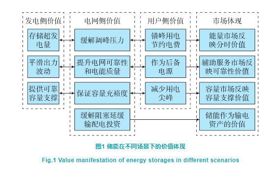 值得注意的是,儲(chǔ)能提供的同一項(xiàng)服務(wù),對(duì)于不同主體有不同的表現(xiàn)形式[20],如圖1所歸納。如削峰填谷,對(duì)電網(wǎng)而言表現(xiàn)為緩解調(diào)峰壓力[21],對(duì)新能源而言表現(xiàn)為存儲(chǔ)超發(fā)電量[22],對(duì)用戶而言表現(xiàn)為錯(cuò)峰用電[23]。由于本文的落腳點(diǎn)在于市場(chǎng)機(jī)制,從市場(chǎng)的角度來看,以上3個(gè)價(jià)值均可以通過能量市場(chǎng)分時(shí)的價(jià)格信號(hào)加以體現(xiàn),由市場(chǎng)采購(gòu)并統(tǒng)一提供。當(dāng)然,這些服務(wù)也可由發(fā)電側(cè)、用電側(cè)主體與儲(chǔ)能簽訂使用協(xié)議而自行購(gòu)買。具體選擇哪種模式,是儲(chǔ)能市場(chǎng)設(shè)計(jì)中待探討的問題。