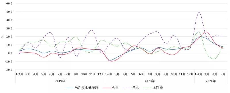 圖8 2019年以來總發(fā)電量及火電、風(fēng)電、太陽能發(fā)電月度增速