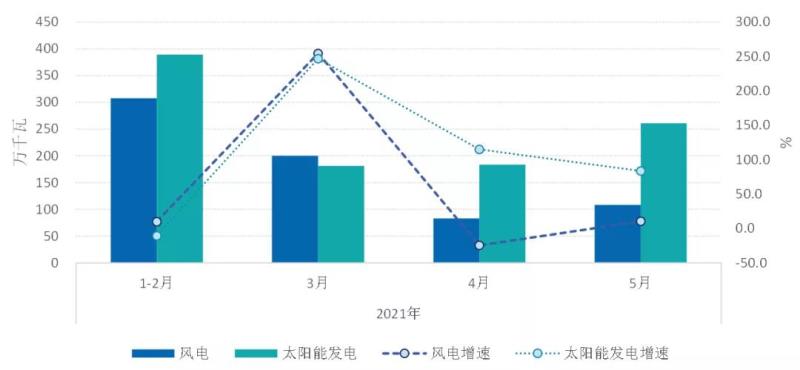 2021年1~5月,全國新增發(fā)電裝機(jī)3734萬千瓦,其中,煤電新增704萬千瓦,較上年同期減少116萬千瓦,并網(wǎng)風(fēng)電和并網(wǎng)太陽能發(fā)電新增裝機(jī)分別為779萬千瓦和991萬千瓦,較上年同期分別增加289萬千瓦和376萬千瓦,合計(jì)新增占總新增比重的47.3%,接近一半。風(fēng)電、太陽能發(fā)電月度新增保持較高的增速。