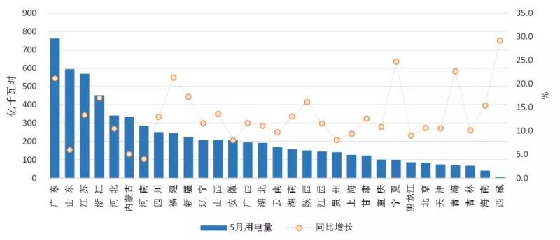 5月當(dāng)月,廣東(762億千瓦時(shí))、山東(595億千瓦時(shí))、江蘇(570億千瓦時(shí))、浙江(453億千瓦時(shí))、河北(342億千瓦時(shí))用電量排名前五。全國23個(gè)省份的用電量增速超過10%。其中,西藏(29.2%)、寧夏(24.7%)、青海(22.7%)、福建(21.4%)、廣東(21.2%)等5個(gè)省份的用電量增速超過20%。貴州(8.1%)、安徽(8.0%)、山東(6.0%)、內(nèi)蒙古(5.1%)、河南(4.0%)用電量增速排名后五位。