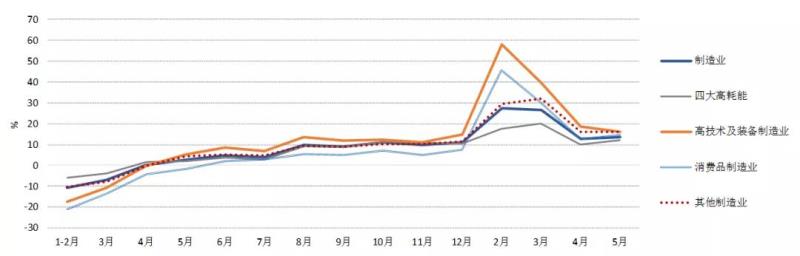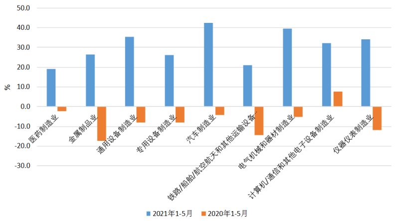 圖4 2020和2021年1~5月高技術(shù)及裝備制造業(yè)分行業(yè)用電量增速