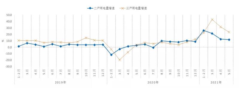 圖2 2019年以來二產(chǎn)和三產(chǎn)分月用電量增速