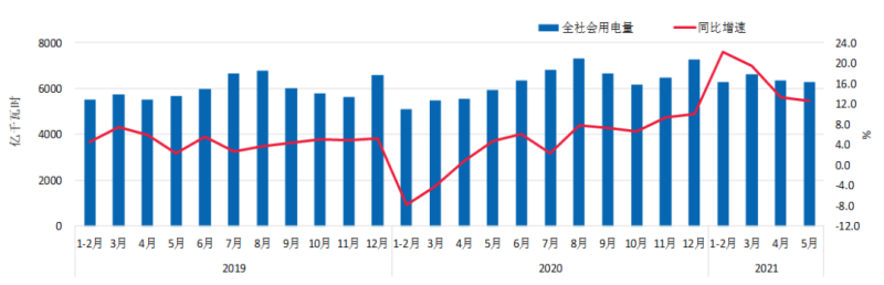 今年前5個(gè)月,全國全社會(huì)用電量累計(jì)32305億千瓦時(shí),同比增長17.7%,較上年同期增速增長7.9個(gè)百分點(diǎn)。從兩年同期平均增速看,年均增長7.4%,較2019年同期增長2.5個(gè)百分點(diǎn)。