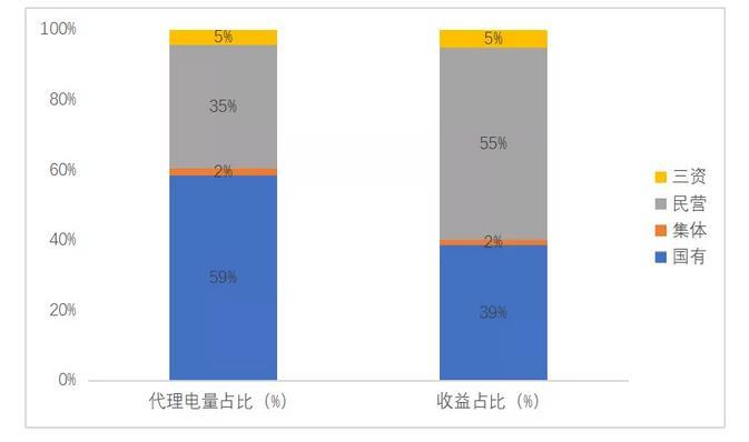 從各類售電公司的代理電量占比和收益占比(圖4)的角度分析,以2020年為例,國(guó)有售電公司平均代理電量占比為59%,平均收益占比為35%;民營(yíng)售電公司平均代理電量占比為39%,平均收益占比為55%;三資售電公司和集體售電公司平均代理電量占比和平均收益占比份額不大,均在10%以下。