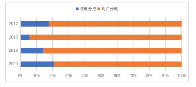 從用戶側(cè)獲利結(jié)構(gòu)看(圖3),2017年至2020年期間,除2018年售電分成略低(5.7%),其余年份售電分成均在14%以上。其中,2018年至2020年期間,售電分成迅速增加,并在2020年達(dá)到了20.7%,為歷年來(lái)最高??傮w來(lái)看,近年售電公司的分成水平呈現(xiàn)出穩(wěn)中有升的趨勢(shì),售電公司能充分享受到供給側(cè)的讓利。