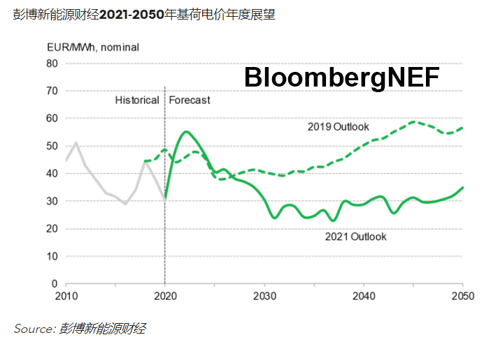 彭博新能源財(cái)經(jīng)預(yù)計(jì),德國基荷電價(jià)在2022年達(dá)到55歐元/兆瓦時(shí)的峰值后回落,到2050年名義電價(jià)下降37%,降至35歐元/兆瓦時(shí)。電價(jià)下滑主要出現(xiàn)在2020-2030年后期。2030年后,電價(jià)在22至35歐元/兆瓦時(shí)之間波動(dòng)。