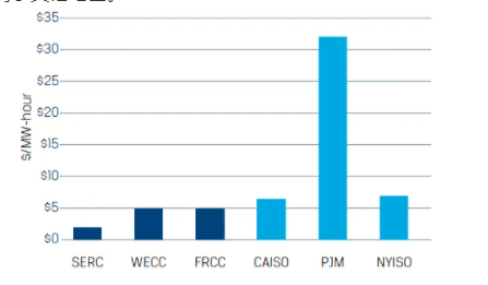 注:SERC、WECC、FRCC為北美可靠性管理委員會(huì)下屬的區(qū)域可靠性委員會(huì)管轄的垂直一體化地區(qū),儲(chǔ)能調(diào)頻收益基于固定價(jià)格確定,CAISO、PJM和NYISO為放開(kāi)管制的電力市場(chǎng),儲(chǔ)能收益基于市場(chǎng)競(jìng)爭(zhēng)機(jī)制確定。