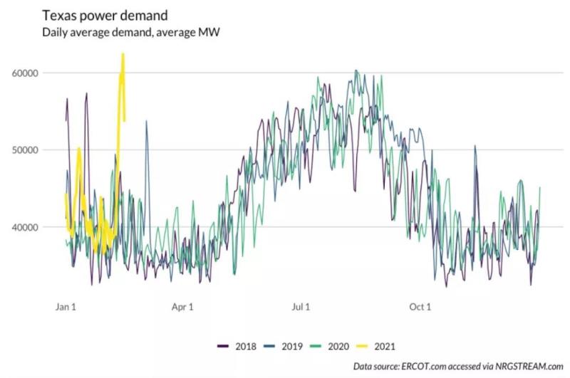 每有問題發(fā)生,普遍的反應就是要找到罪魁禍首。德州電荒的一個重要原因顯然是前所未有的寒冷天氣。下圖是德州近年來的用電需求走勢,可以看到2020年這幾天的用電高峰是前所未有的;而且寒潮導致近30GW的發(fā)電設(shè)施無法工作,也是前所未有的。