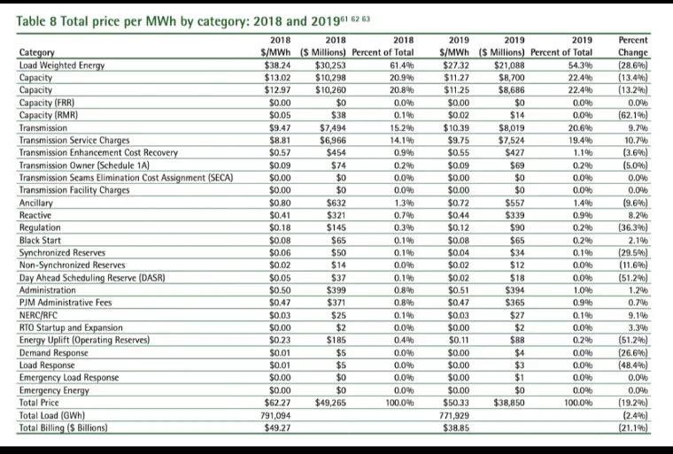 引入電力容量市場,就是希望保證發(fā)電容量足夠,降低德州這種電價飆升的情況。但是電力容量市場不是免費的。容量市場相當于平時買了保險(保費也許很高)。比如在筆者現(xiàn)在所在的新澤西州(PJM電網(wǎng))引入電力容量市場后,意味著每度電要增加$0.011-0.013的“容量費”(如下圖電力價格分解中“Capacity”所示)。這并不是一個小數(shù)目。從一些國外電力容量市場的情況看,電力容量市場有些時候變成了老舊發(fā)電設(shè)備延續(xù)生命、以及浪費消費者金錢的一種方式。