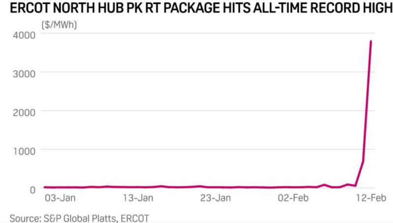 從上周末開始,德州的批發(fā)電力價格就開始暴漲。下圖是ERCOT批發(fā)電力價格的從1月到上周末的走勢圖,可以看到收到寒潮影響,電價飆升了一百倍。