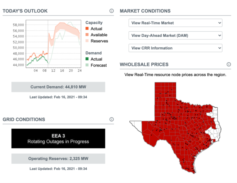下圖是筆者2月16日早上登陸的情況,從左上角的圖片可以看到實時的電力需求和之后的預測,以及電力供應保障。可以看到傍晚的用電高峰時期仍有可能電力供應不足。右下角的圖片是實時的各地電力批發(fā)價格,現(xiàn)在幾乎全部飆(深)紅,表示已經(jīng)到了價格上限。德州的電力批發(fā)價格有一個上限:9美元/度,但是加上擁堵費等等,各地電力批發(fā)價格最多可以超過12美元/度,這些深紅表示基本上都在9美元/度以上了。