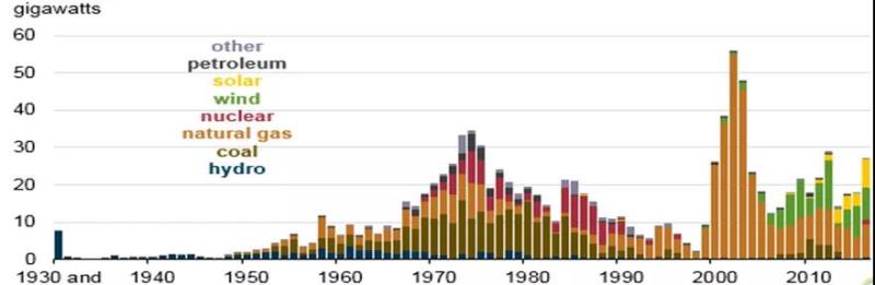 圖2 美國新增各類型機(jī)組裝機(jī)容量變化趨勢(shì)圖