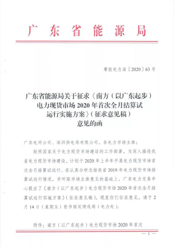 2月6日,廣東省能源局下發(fā)關(guān)于征求《南方 (以廣東起步) 電力現(xiàn)貨市場2020年首次全月結(jié)算試運(yùn)行實(shí)施方案》(征求意見稿)意見的函(以下簡稱《方案》),計劃于今年上半年開展電力現(xiàn)貨市場首次全月結(jié)算試運(yùn)行。