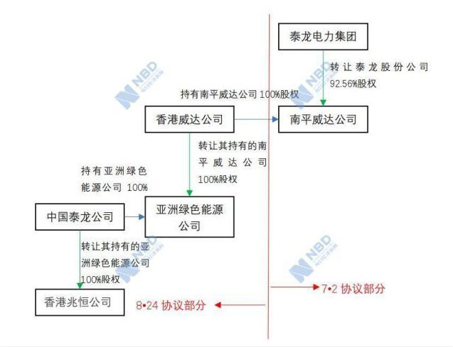 據(jù)前述《判決書》和葉躍松向《每日經(jīng)濟(jì)新聞》記者提供的8·24協(xié)議掃描件,8·24協(xié)議的4.3(3)條款有如此約定:“于簽訂本協(xié)議的同時(shí),泰龍電力集團(tuán)、廈門漢銀公司須與買方(或其指明的公司或人士)各簽訂一份股權(quán)轉(zhuǎn)讓協(xié)議,泰龍電力集團(tuán)、廈門漢銀公司同意轉(zhuǎn)讓其持有的泰龍股份公司92.56%、1.18%股權(quán)給買方(或其指明的公司或人士);同時(shí),威達(dá)(香港)能源開發(fā)有限公司(以下簡(jiǎn)稱香港威達(dá)公司)須與買方(或其指明的公司或人士)簽訂一份股權(quán)轉(zhuǎn)讓協(xié)議,香港威達(dá)公司同意轉(zhuǎn)讓其持有的南平威達(dá)公司100%股權(quán)給買方(或其指明的公司或人士)。”