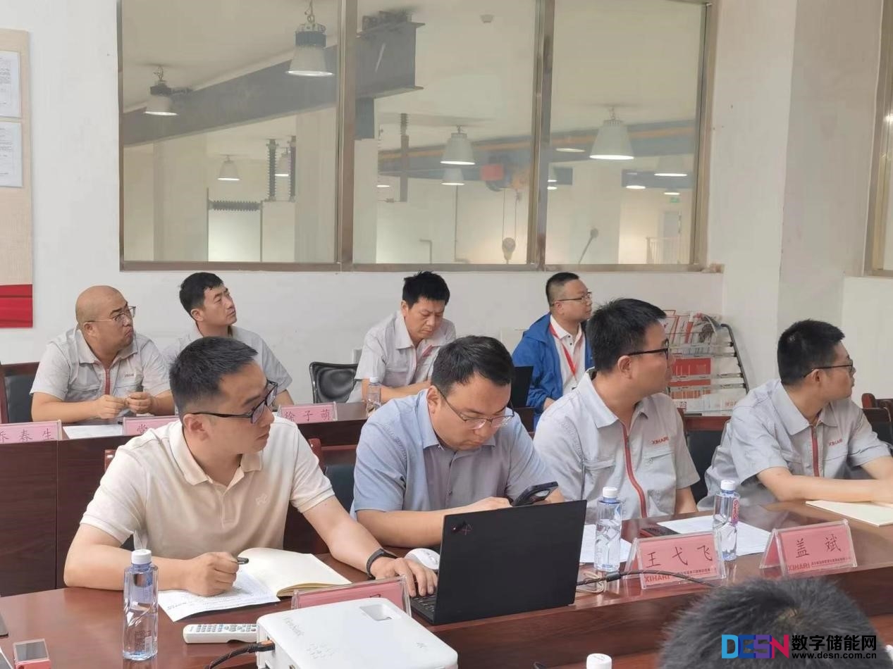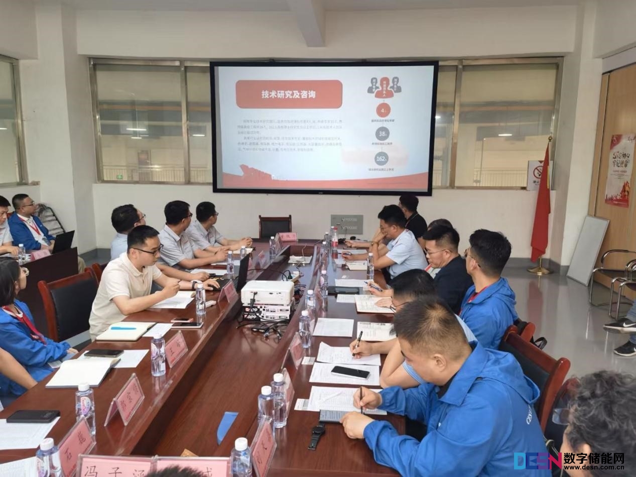 參觀結(jié)束后,雙方進(jìn)行了技術(shù)交流座談,王弋飛為調(diào)研團(tuán)一行重點介紹了公司各業(yè)務(wù)線發(fā)展、風(fēng)光儲電站電網(wǎng)適應(yīng)性檢測平臺、光儲變流器測試方案以及電池測試能力建設(shè)等情況。
