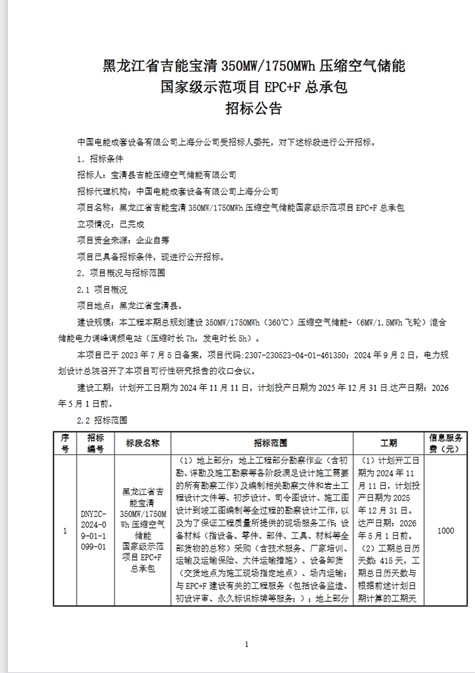 中國儲能網(wǎng)訊:9月30日,寶清縣吉能壓縮空氣儲能有限公司發(fā)布黑龍江省吉能寶清350MW/1750MWh壓縮空氣儲能國家級示范項(xiàng)目EPC+F總承包招標(biāo)公告。