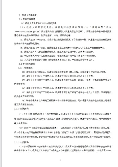 要求投標(biāo)人近5年內(nèi),應(yīng)具有至少2臺350MW級及以上火電勘察設(shè)計(jì)業(yè)績和2臺350MW級及以上火電EPC總承包(或施工)業(yè)績。近10年,應(yīng)具有至少1個水利水電工程(需包含地下隧洞工程)或1個水電站地下硐室群的勘察設(shè)計(jì)和EPC總承包(或施工)業(yè)績。