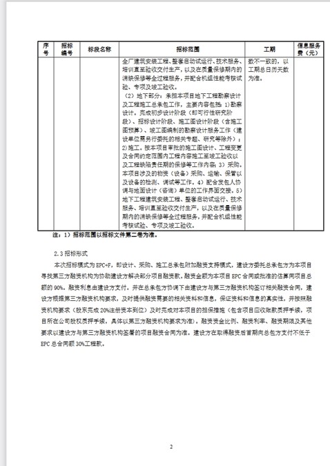 本次招標(biāo)模式為EPC+F,即設(shè)計(jì)、采購、施工總承包附加融資支持模式,建設(shè)方委托總承包方為本項(xiàng)目尋找第三方融資機(jī)構(gòu)為協(xié)助建設(shè)方解決部分項(xiàng)目融資款。