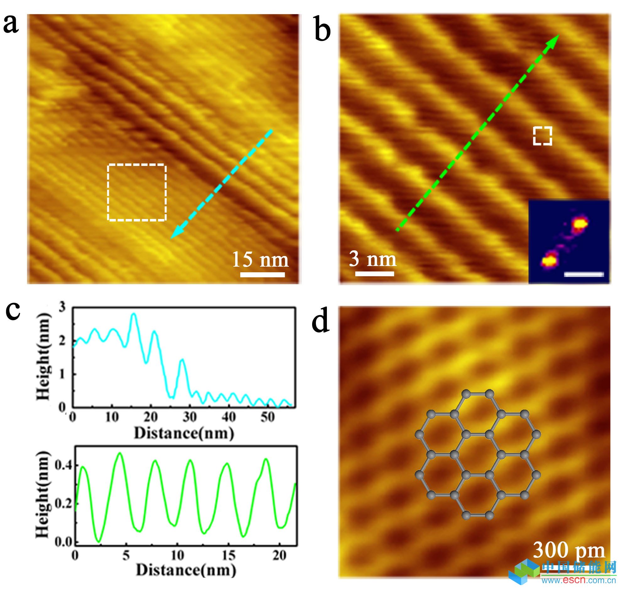 最近,何林老師指導(dǎo)博士生白珂珂等人與北京大學(xué)化學(xué)學(xué)院的劉忠范/彭海琳教授指導(dǎo)的博士生周喻合作,在應(yīng)變石墨烯的結(jié)構(gòu)及其電學(xué)性質(zhì)研究上又取得了重要進(jìn)展。他們利用本課題組的掃描隧道顯微鏡(STM)對生長在Cu箔上的馬賽克石墨烯(局域氮參雜石墨烯)進(jìn)行了系統(tǒng)測量,發(fā)現(xiàn)該樣品上能實(shí)現(xiàn)周期為幾個(gè)納米到幾十納米的準(zhǔn)一維周期性褶皺(如圖1),這些準(zhǔn)一維褶皺的長度大約在400納米到一微米之間。根據(jù)經(jīng)典薄膜理論,在石墨烯中實(shí)現(xiàn)周期為納米量級的褶皺,需要將石墨烯的尺寸縮小到10個(gè)納米以下。而在如此小尺寸的石墨烯上要施加一個(gè)應(yīng)力使其產(chǎn)生周期的應(yīng)變結(jié)構(gòu)遠(yuǎn)遠(yuǎn)超過了當(dāng)前技術(shù)的極限,這一傳統(tǒng)認(rèn)識一直制約著人們對石墨烯應(yīng)變結(jié)構(gòu)的進(jìn)一步深入研究。
