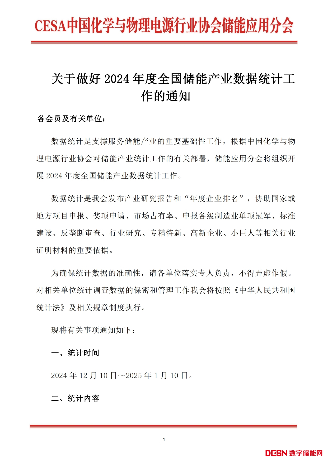 關(guān)于做好2024年度全國(guó)儲(chǔ)能產(chǎn)業(yè)數(shù)據(jù)統(tǒng)計(jì)工作的通知