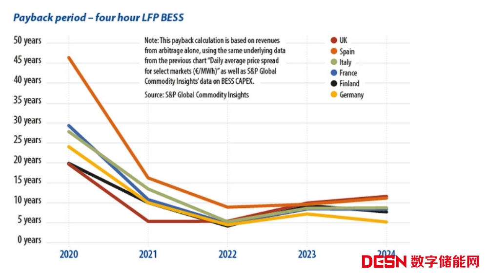 圖1 持續(xù)時間為4小時電池儲能系統(tǒng)的投資回報時間快速下降