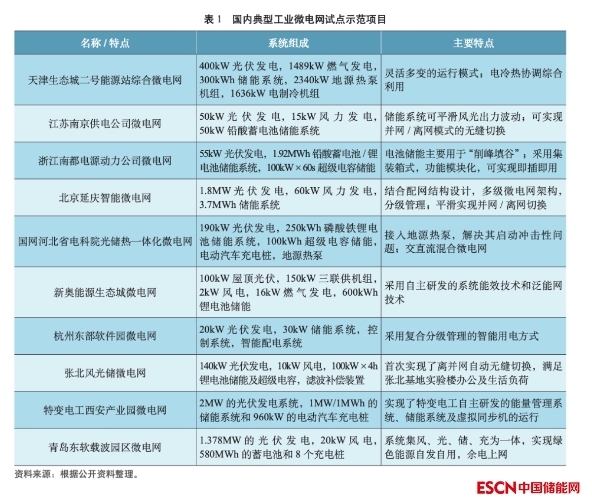 當(dāng)前,我國(guó)工業(yè)綠色微電網(wǎng)的建設(shè)仍處于示范和試點(diǎn)階段。一些研究提出了工業(yè)用戶和園區(qū)場(chǎng)景下綠色微電網(wǎng)的運(yùn)行方式、運(yùn)營(yíng)模式和應(yīng)用場(chǎng)景,結(jié)合試點(diǎn)項(xiàng)目總結(jié)提出了微電網(wǎng)系統(tǒng)的規(guī)劃方法和控制策略,從不同角度證實(shí)了工業(yè)綠色微電網(wǎng)的技術(shù)可行性。在國(guó)家開展的試點(diǎn)示范項(xiàng)目中也不乏工業(yè)綠色微電網(wǎng)的身影。2017年4月,吐魯番新能源城市的微電網(wǎng)示范項(xiàng)目獲得售電許可,成為我國(guó)第一例獲得供電類電力業(yè)務(wù)許可證的微電網(wǎng)項(xiàng)目。同年7月,國(guó)家能源局確定了24個(gè)并網(wǎng)型、4個(gè)獨(dú)立型共28個(gè)新能源微電網(wǎng)示范項(xiàng)目。部分工業(yè)綠色微電網(wǎng)項(xiàng)目也結(jié)合“能源互聯(lián)網(wǎng)”“增量配電業(yè)務(wù)改革”“智能光伏”“源網(wǎng)荷儲(chǔ)一體化”“零碳產(chǎn)業(yè)園區(qū)”等其他目標(biāo)進(jìn)行了試點(diǎn)示范(附表)。一些配有較高比例零碳電源的工業(yè)微電網(wǎng)項(xiàng)目也已建成投產(chǎn)(表1)。