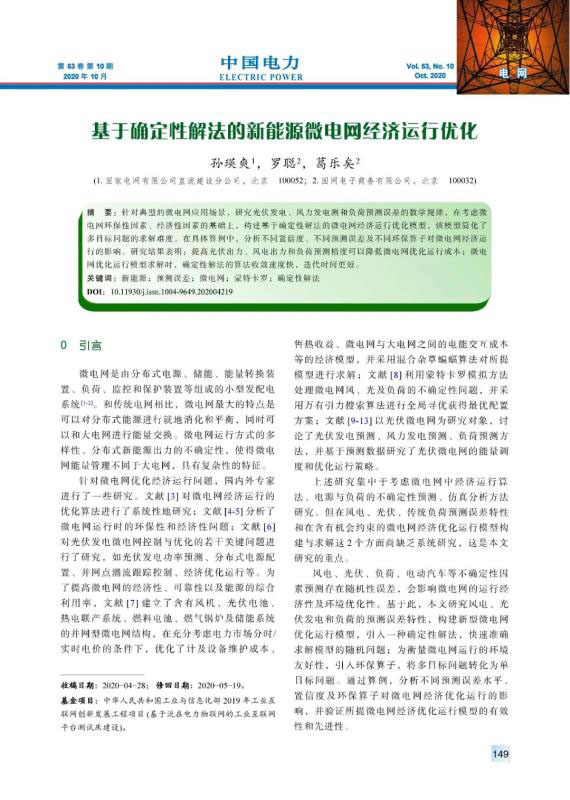 SUN Yingshuang, LUO Cong, GE Leyi. Economic operation optimization for new energy microgrid based on deterministic method[J]. Electric Power, 2020, 53(10): 149-155.