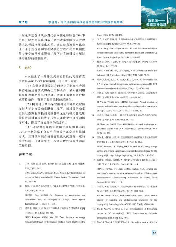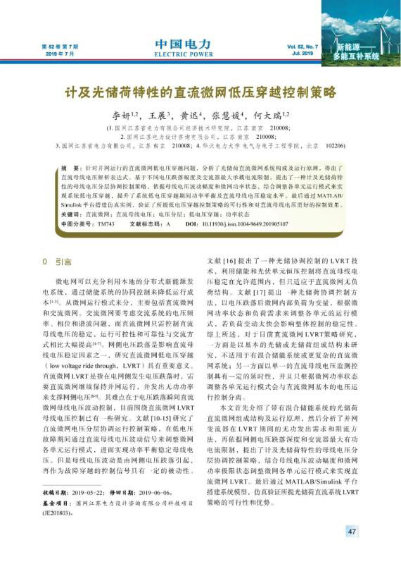 李妍, 王展, 黃迅, 等. 計及光儲荷特性的直流微網(wǎng)低壓穿越控制策略[J]. 中國電力, 2019, 52(7): 47-54.