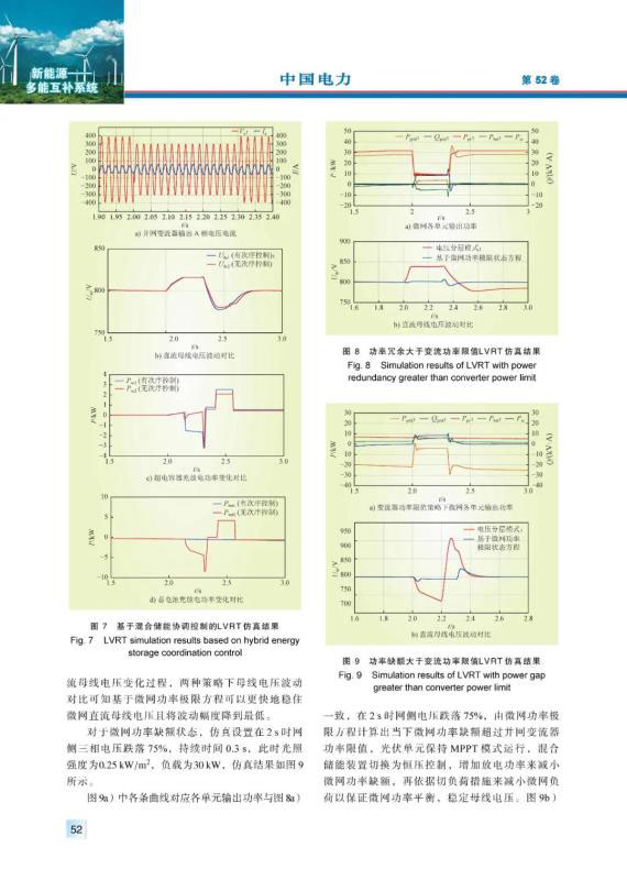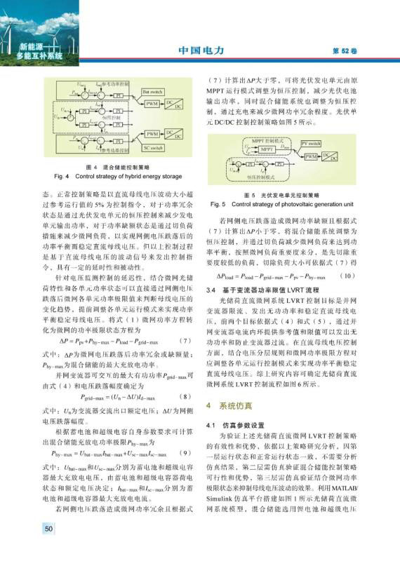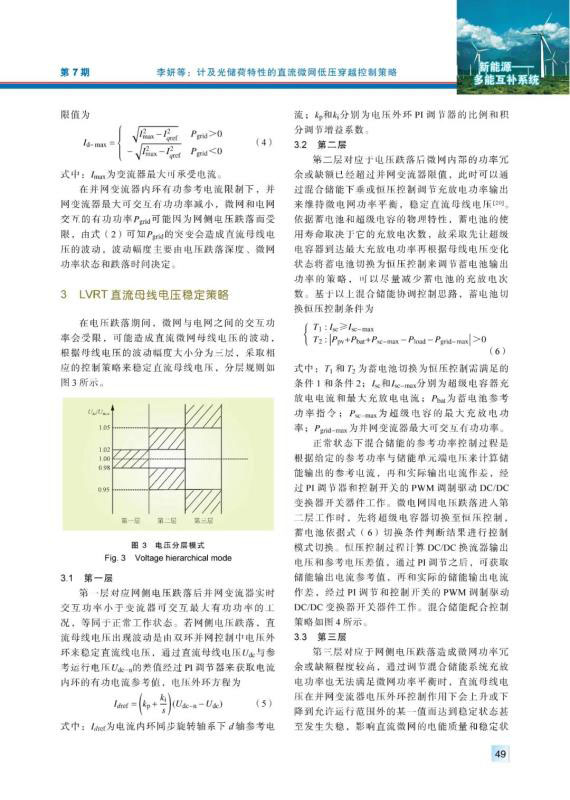 摘要:針對并網(wǎng)運行的直流微網(wǎng)低電壓穿越問題,分析了光儲荷直流微網(wǎng)系統(tǒng)構(gòu)成及運行原理,得出了直流母線電壓解析表達式?;诓煌妷旱浞燃白兞髌髯畲蟪休d電流限制,提出了一種計及光儲荷特性的母線電壓分層協(xié)調(diào)控制策略,依據(jù)母線電壓波動幅度和微網(wǎng)功率狀態(tài),綜合調(diào)整各單元運行模式來實現(xiàn)系統(tǒng)低電壓穿越,提升了系統(tǒng)低電壓穿越期間功率平衡及直流母線電壓穩(wěn)定水平。最后通過MATLAB/Simulink平臺搭建仿真實例,驗證了所提低電壓穿越控制策略的可行性和對直流母線電壓更好的控制效果。