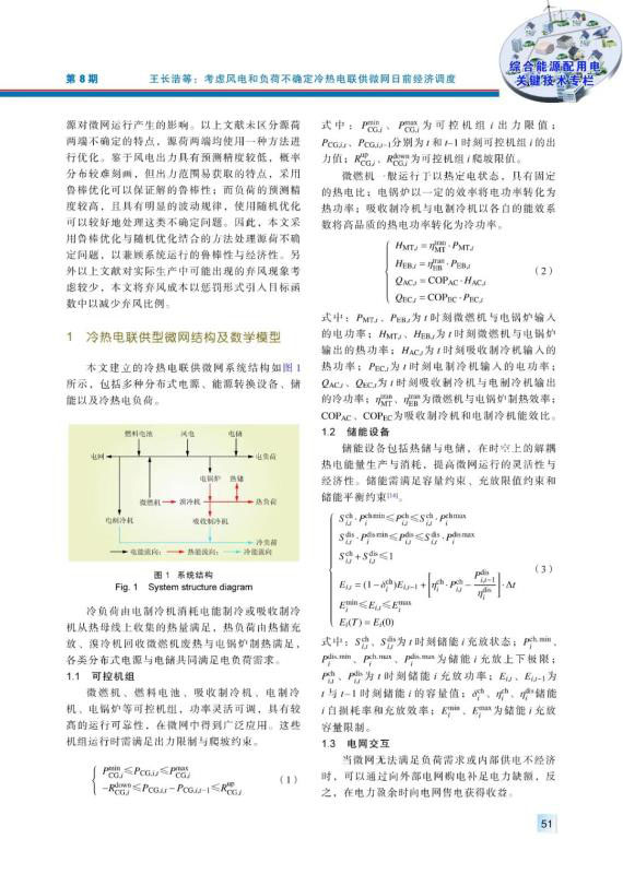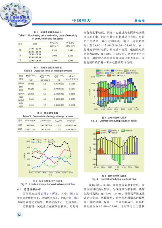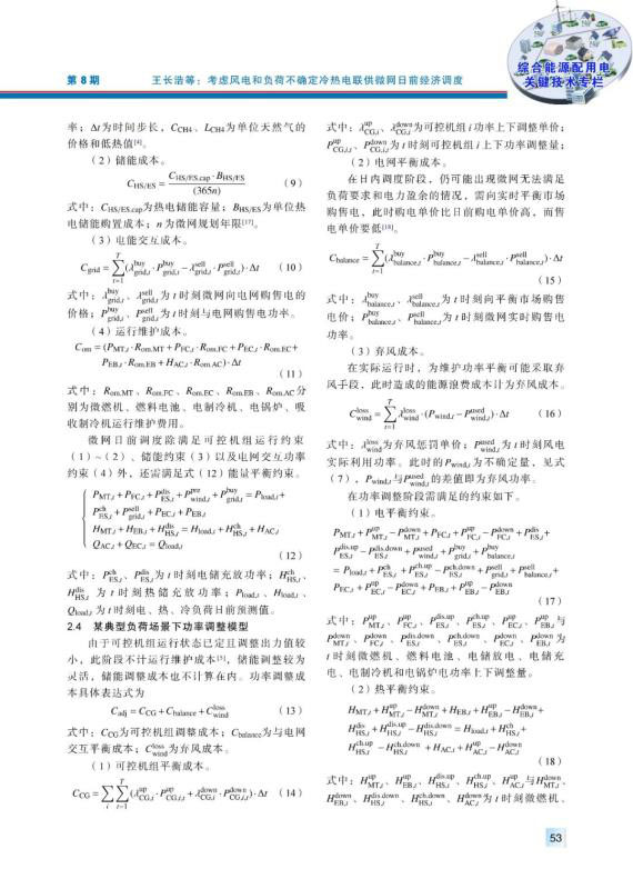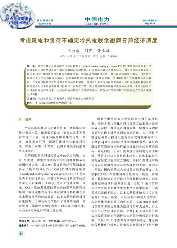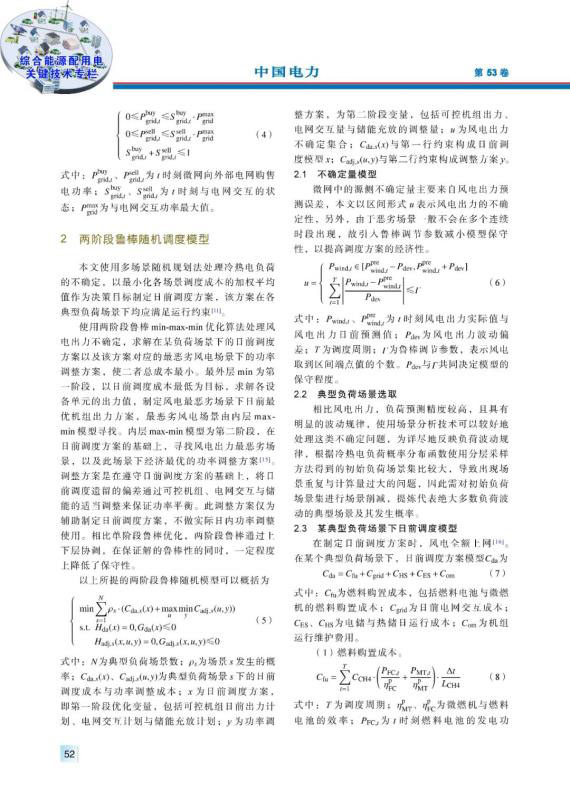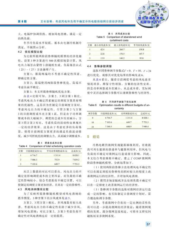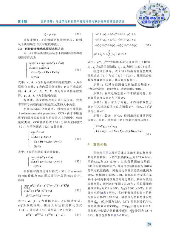 以含多種分布式電源的冷熱電聯(lián)供(combined cooling heating and power, CCHP)微網(wǎng)為研究對象,考慮風(fēng)電出力和冷熱電負(fù)荷不確定對微網(wǎng)運(yùn)行的影響,區(qū)分源荷不確定各自的特點(diǎn),建立考慮風(fēng)電和負(fù)荷不確定的CCHP微網(wǎng)兩階段魯棒隨機(jī)調(diào)度模型。雖然風(fēng)電預(yù)測精度較低,但其波動范圍易于測量,可以使用魯棒優(yōu)化方法處理風(fēng)電不確定;負(fù)荷預(yù)測精度較高且有較強(qiáng)波動規(guī)律,使用隨機(jī)優(yōu)化方法處理負(fù)荷不確定。首先通過隨機(jī)抽樣形成多個(gè)負(fù)荷場景并削減,得到多個(gè)典型冷熱電負(fù)荷場景;然后以最小化各場景的調(diào)度成本加權(quán)平均值為決策目標(biāo)制定日前調(diào)度方案,該方案使用兩階段魯棒優(yōu)化方法求解。考慮實(shí)際生產(chǎn)中可能出現(xiàn)的棄風(fēng)現(xiàn)象,為增加風(fēng)電消納引入棄風(fēng)懲罰成本。算例仿真結(jié)果證明了所提調(diào)度方法的合理性與經(jīng)濟(jì)性。