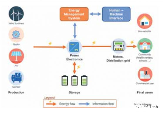 最初,小型電網(wǎng)完全是以柴油發(fā)電或水力發(fā)電為基礎(chǔ)的。過去10年,光伏價(jià)格的下跌有利于開發(fā)基于光伏的小型電網(wǎng)。當(dāng)前的典型項(xiàng)目包括光伏組件、電池、備用柴油發(fā)電機(jī)、能源管理系統(tǒng)(EMS)。此外,當(dāng)然還包括逆變器、電表和當(dāng)?shù)仉娋W(wǎng),