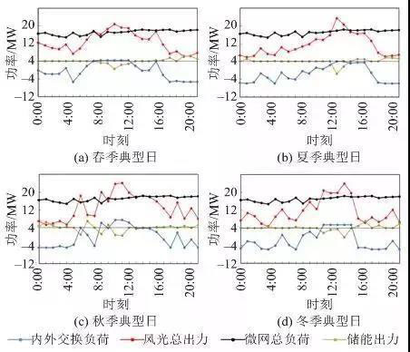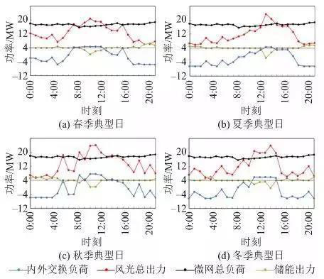 圖9和圖10為傳統(tǒng)運(yùn)營模式和一體化運(yùn)營模式下,春、夏、秋、冬四季典型日微網(wǎng)的運(yùn)行情況(儲(chǔ)能出力負(fù)值表示充電,內(nèi)外交換負(fù)荷負(fù)值表示外