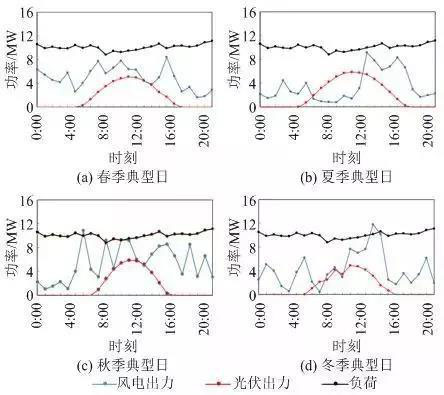 圖8為四季典型日微網(wǎng)風(fēng)光出力和負(fù)荷曲線。