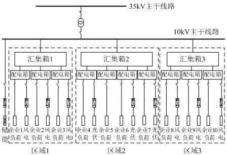 微網(wǎng)分為3塊區(qū)域,均為大工業(yè)用戶,電壓等級(jí)為10kV,最大負(fù)荷為11.13MW。項(xiàng)目壽命周期為20年,設(shè)備綜合造價(jià)及相關(guān)成本參考當(dāng)?shù)貥?biāo)準(zhǔn),基準(zhǔn)折現(xiàn)率取7%。傳統(tǒng)運(yùn)營模式下微網(wǎng)項(xiàng)目總投資約1.62億元,其中源側(cè)約14500萬元,網(wǎng)側(cè)投約310萬元,儲(chǔ)側(cè)約900萬元,信息化平臺(tái)(能量管理系統(tǒng))約500萬元;一體化運(yùn)營模式總投資約1.68億元,其中源網(wǎng)儲(chǔ)側(cè)投資變化不大,信息化平臺(tái)(大數(shù)據(jù)云計(jì)算平臺(tái)、微平衡市場(chǎng)交易系統(tǒng)、能量管理系統(tǒng))約1100萬元。圖7為微網(wǎng)接線方案示意圖。