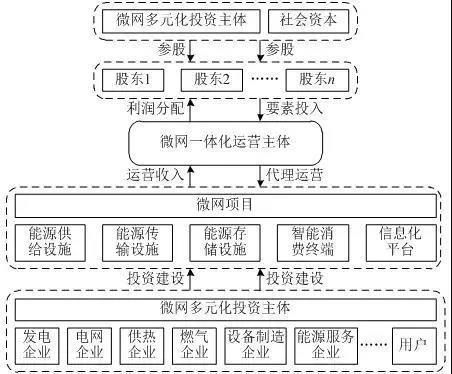 目前我國已投資建設(shè)大量微網(wǎng)項(xiàng)目,其中大部分微網(wǎng)“源-網(wǎng)-荷-儲(chǔ)”各環(huán)節(jié)能源設(shè)施由單一主體投資建設(shè)運(yùn)營。但是分布式能源、傳輸網(wǎng)絡(luò)、儲(chǔ)能等能源設(shè)施投資規(guī)模大,缺乏合理投資回報(bào)模式,微網(wǎng)項(xiàng)目主體將承擔(dān)較大投資風(fēng)險(xiǎn)。因此,本文提出微網(wǎng)運(yùn)營一體化和投資多元化的模式框架。