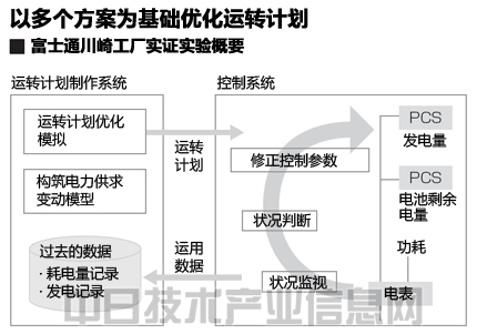 富士通的微電網(wǎng)實證實驗每小時修正一次運(yùn)轉(zhuǎn)計劃,截至2012年12月,已取得了高峰用電量平均削減23%的效果。為了削減高峰用電量,多是采用預(yù)測當(dāng)天日照量最低值的方法,但現(xiàn)已確認(rèn),采用富士通在實驗中實施的反復(fù)模擬法,偏差小。